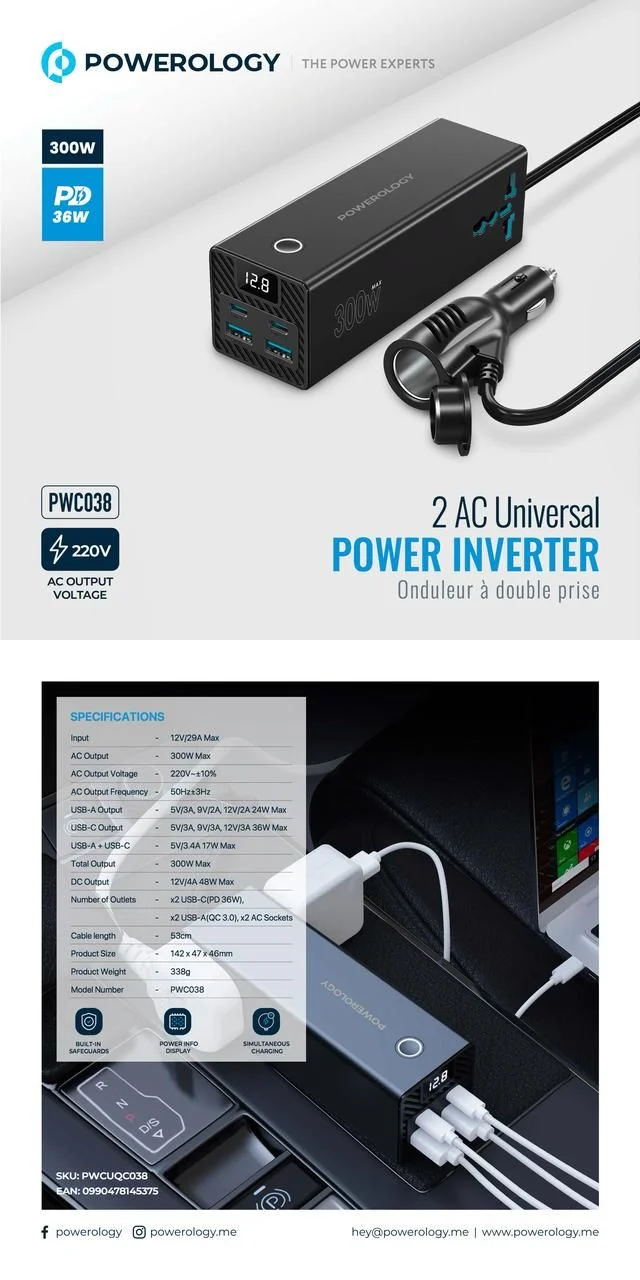 اینورتر خودرو Powerology 2AC Universal 300W Power Inverter PD 36W یک گزینه بسیار خوب و چندمنظوره برای افرادی است که به دنبال یک راهحل شارژ کامل در خودروی خود هستند. توان 300 وات AC به همراه پورتهای شارژ سریع USB-C PD و USB-A QC، آن را برای اکثر نیازهای شارژ روزمره و سفر (از شارژ گوشی و تبلت گرفته تا روشن کردن لپتاپ یا یک فن کوچک) مناسب میسازد. سیستمهای حفاظتی داخلی نیز به کاربر اطمینان خاطر میدهند.
